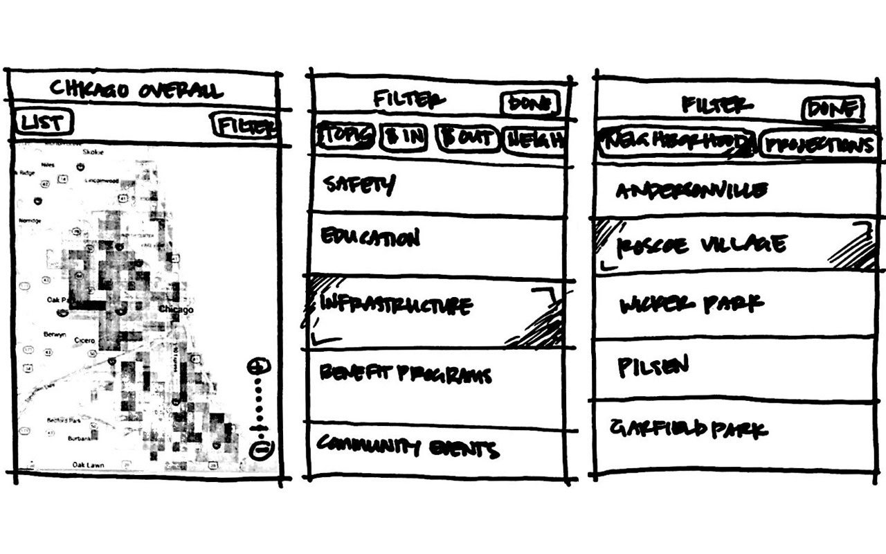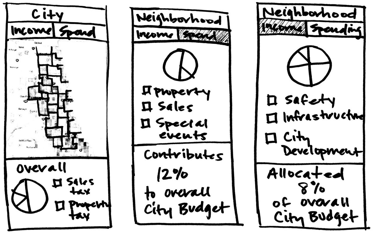 We developed three paper prototypes to test the data’s portrayal by neighborhood, organization into topics, and level of granularity within a flow. While the progression of information was similar between prototypes, navigation and data representation varied.