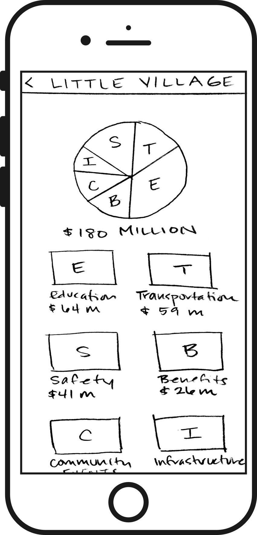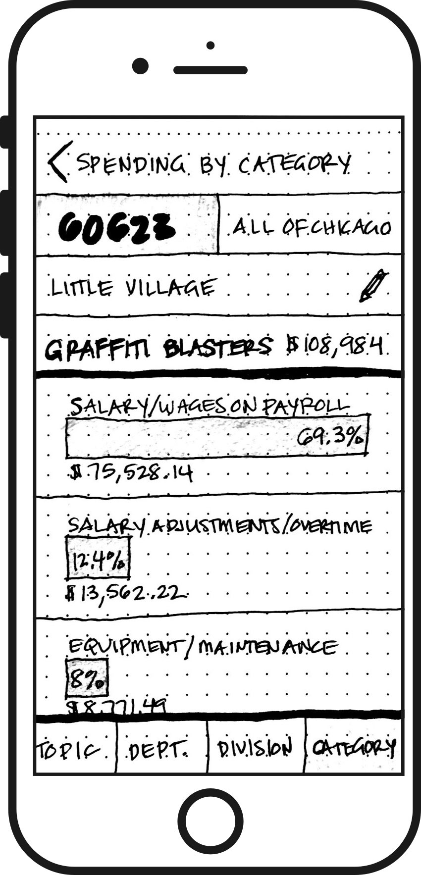 My prototype gave users the option of two parallel flows from any point. Tabs allowed users to switch between the city as a whole or a neighborhood by zip code. Although users had more freedom, they found it wasn’t as intuitive. I split the annual budget into sections most aligned to the data portal source using both pie and bar charts. Users responded to the bottom navigation breadcrumbs, which supported jumping between levels of granularity.